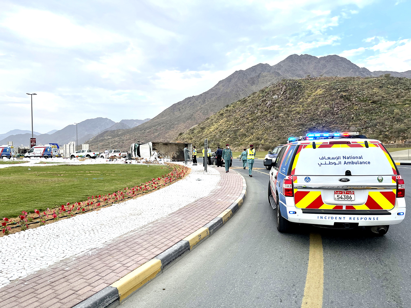 الإسعاف الوطني يستجيب إلى حادث تصادم بين شاحنة ومركبة على شارع خورفكان الشارقة